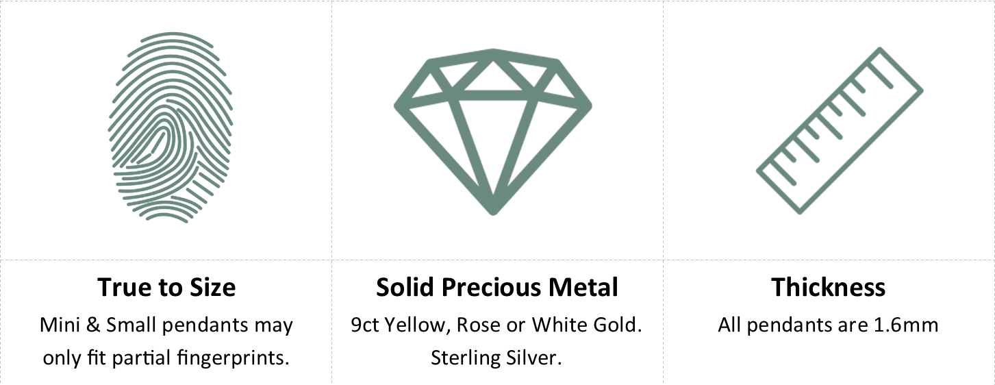 Fingerprints are kept true to size, 9ct Yellow, Rose or White Gold, and thick quality pendants.