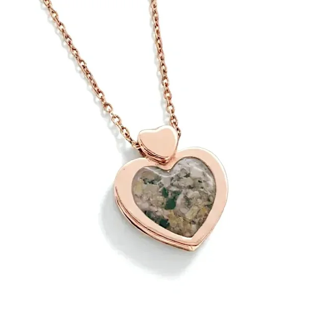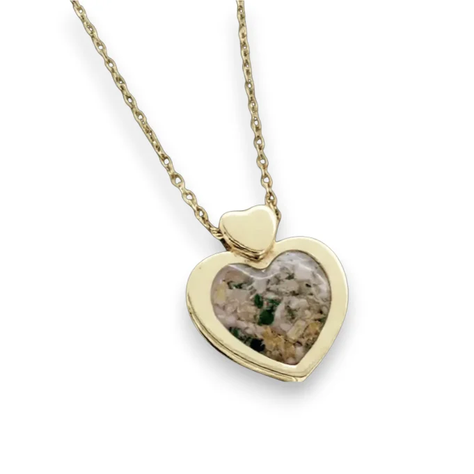 Introducing the Hue Ashes Pendant: symbolizing heart or spirit. This heart-shaped pendant with a matching bail encapsulates your loved one’s ashes within another heart.