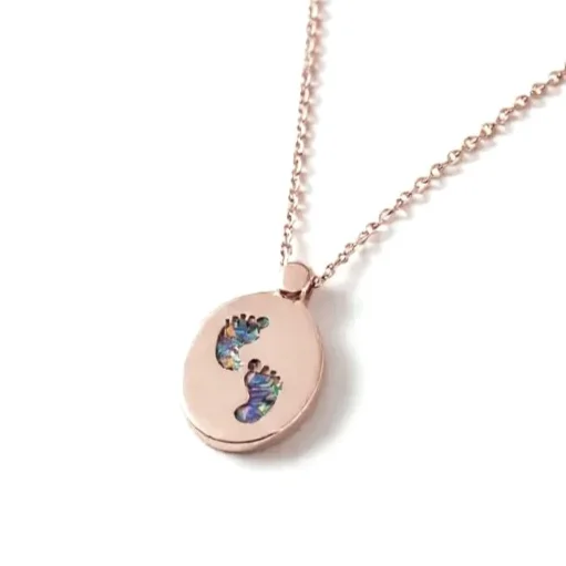 The pendant features a specially crafted oval shape with a distinctive oval bail designed for your chain. It tenderly encases your loved one’s ashes within the charming little feet.