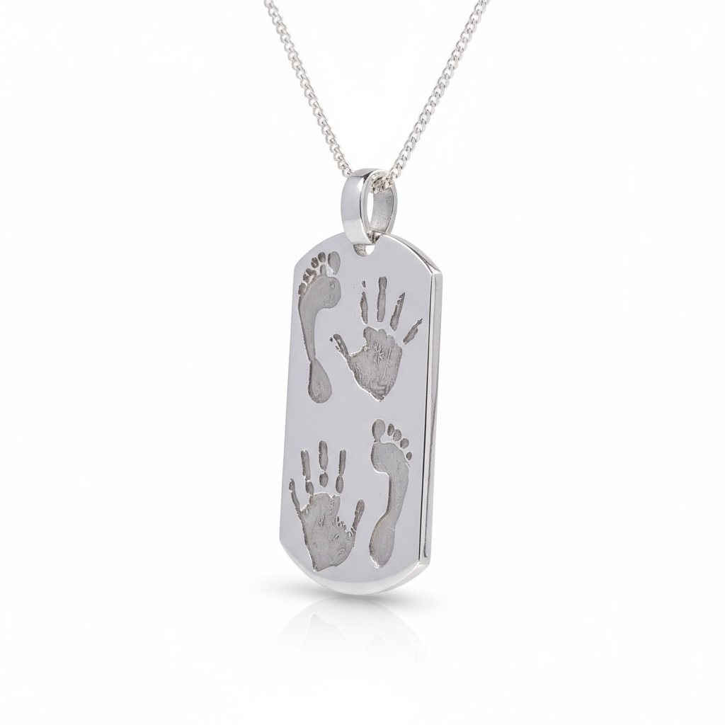 Carry the imprint of your loved one with our Original Dogtag Handprint/Footprint Pendant in Sterling Silver.