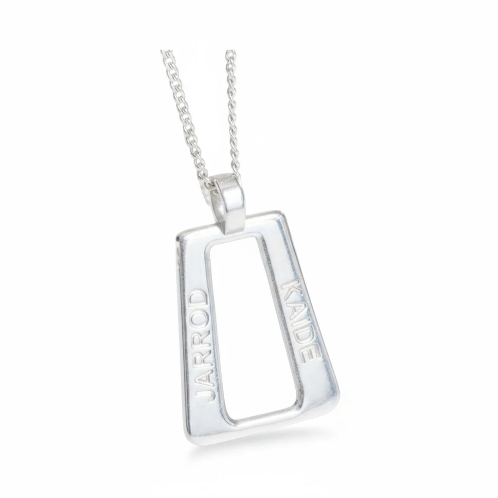 Personalised Triangle Two Name Pendant. Family and the ones we love are special and dear to us all.  Having the names of those loved ones in a Uneik Jewellery piece allows you to celebrate those special to you.  It gives you something to hold when they are missed, a reminder that they are always with you, or a way to express how proud you are to have them in your life.  A precious jewellery piece made especially for you to treasure always.  Personalised the way you want it.  Use names, birthdates, sayings, or even coordinates – it’s up to you!